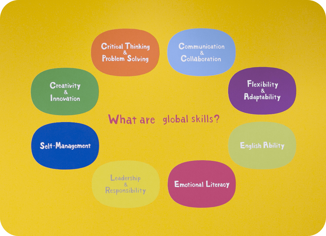 基礎をつくる英語はあくまでコミュニケーションの手段にすぎません。当スクールでは、日々のレッスンやアクティビティを通じて、英語を使いながら自信・協調性・好奇心といった「グローバルスキル」を養い、将来どんな環境でも活躍できるグローバル人材への基礎をつくります。