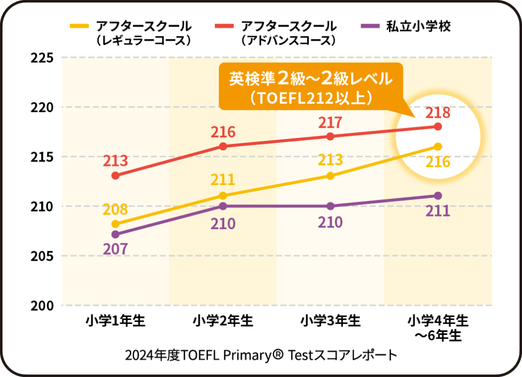 2級相当の英語力当スクールに4年間通った子どもたちは、英語を勉強ではなく”日常のコミュニケーション手段として活用できる”レベルに成長。英検準2級レベルの英語力(TOEFL Primary® Test212以上)が身につきます。